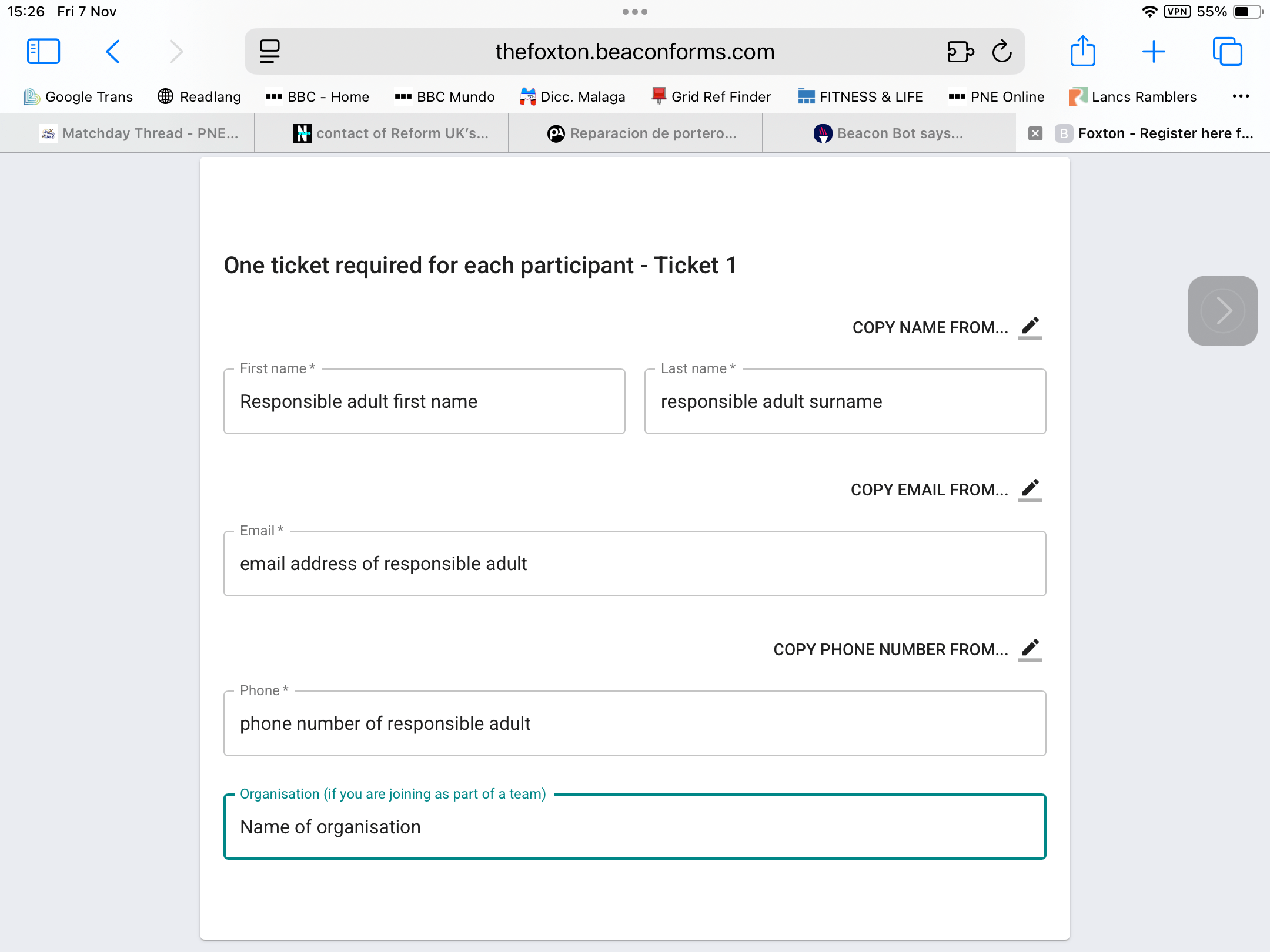 The second part of the form which asks for the details of the attendees being registered should be completed in the name of the responsible adult and the organisation. See diagram below: