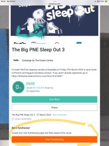 On March 27th, 2026, the third Big PNE Sleep Out is being held at Deepdale. The event is open only to those age 18 years or older. Young people, schools, families wanting to participate in supporting the initiative are encouraged to organise their own activity and liaise with the main event though Jack.mountain@pne.com